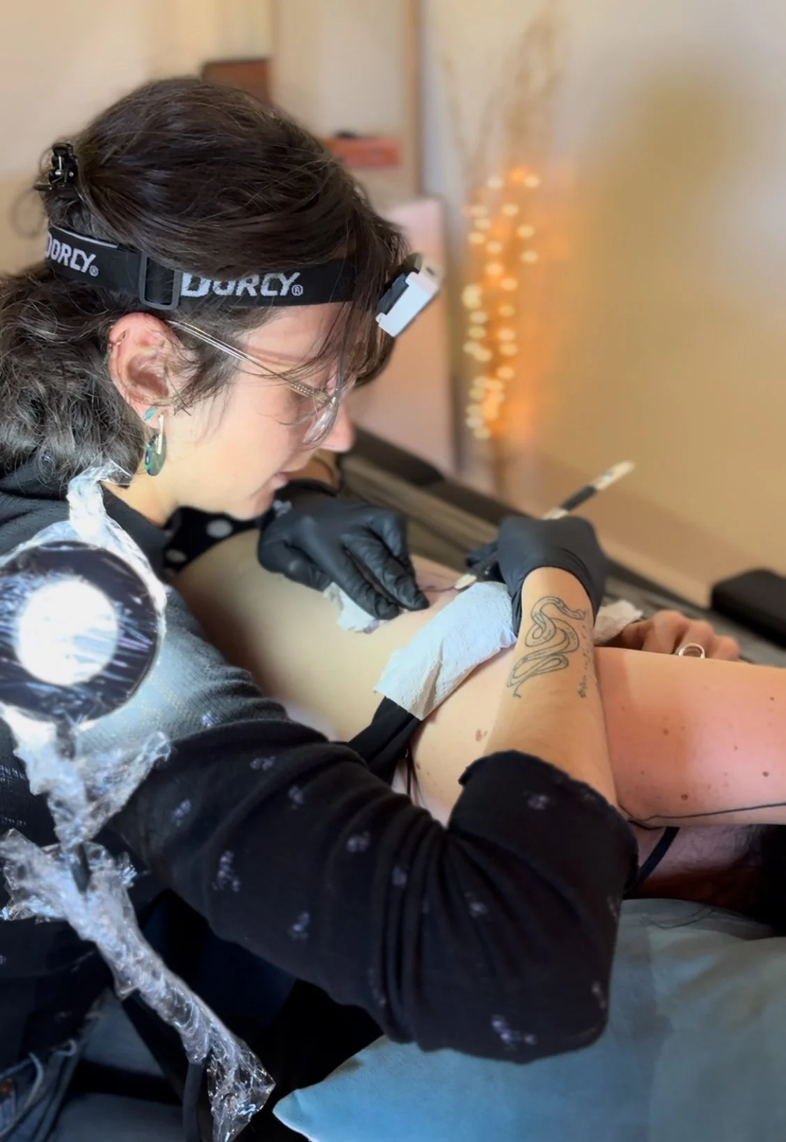 I started handpoking in 2021 on people I met on the road. They told me their story and I translated it into designs. Thanks to them, I could improve my skills in tattooing.